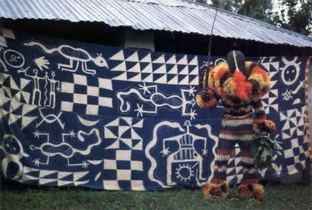 An Ekpe masquerade performance set against a Ukara cloth backdrop