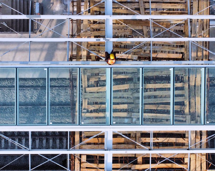 Aerial photo of a worker atop the roof of the Marina Train Station, Lagos, during construction. November 2022.