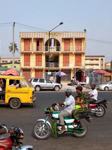 Shopping complex with people in vehicles and motorcycles in the foreground. Yaba Market, Lagos. December 2018.